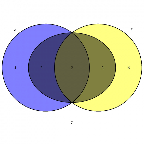 venn.diagram(list(x=1:10,y=7:12,z=9:16),fill=c("yellow","black","blue"),