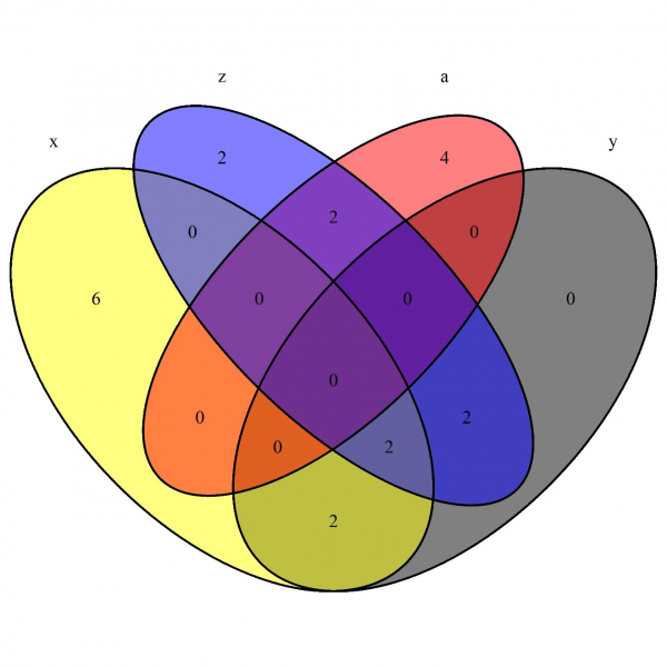 venn.diagram(list(x=1:10,y=7:12,z=9:16,a=15:20),fill=c("yellow","black","blue","red"),