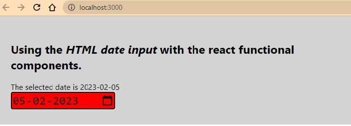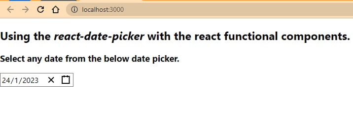 在下面的示例中,我们使用了 HTML input 来创建日期选择器,如上面的语法所示。此外,我们还使用了钩子来处理日期输入。每当用户选择日期时,它都会调用 onDateChange() 函数,我们使用 setDate() 函数将日期值设置为 date 变量。