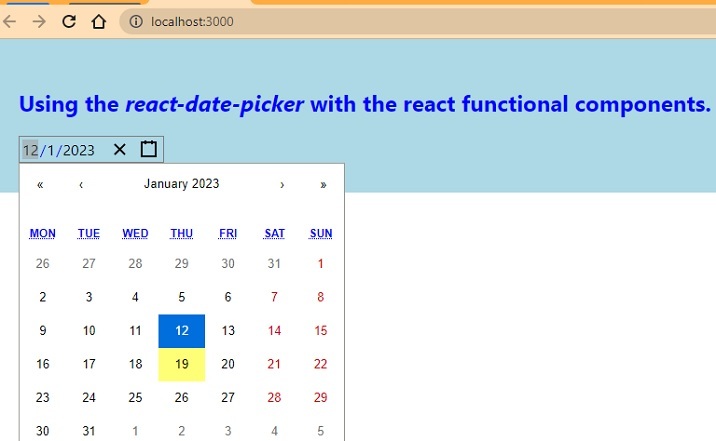 在这个示例中,我们也使用 react-date-picker 实现日期选择器,但是我们自定义了日期选择器。用户可以看到我们向 DatePicker 组件传递了不同的 props。