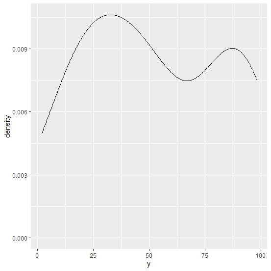 library(ggplot2) x<-sample(LETTERS[1:3],20,replace=TRUE) y<-sample(1:100,20) df<-data.frame(x,y) ggplot(df,aes(y))+geom_density()