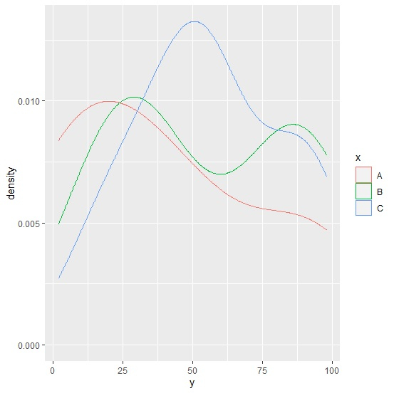 library(ggplot2) x<-sample(LETTERS[1:3],20,replace=TRUE) y<-sample(1:100,20) df<-data.frame(x,y) ggplot(df,aes(y))+geom_density(aes(col=x),alpha=0.2)