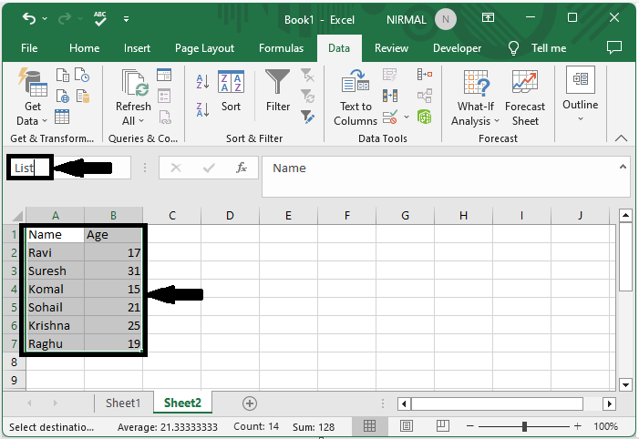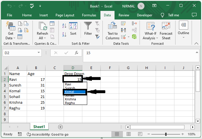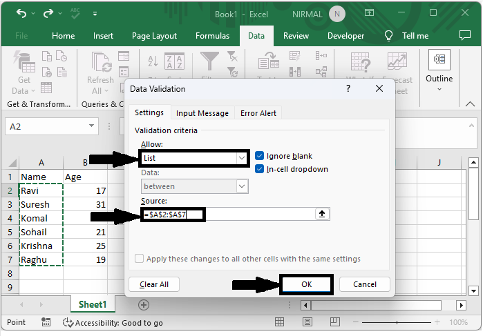 然后单击要插入下拉列表的空单元格,然后单击数据并选择数据有效性。然后将允许设置为列表并将源设置为名称,然后单击确定。