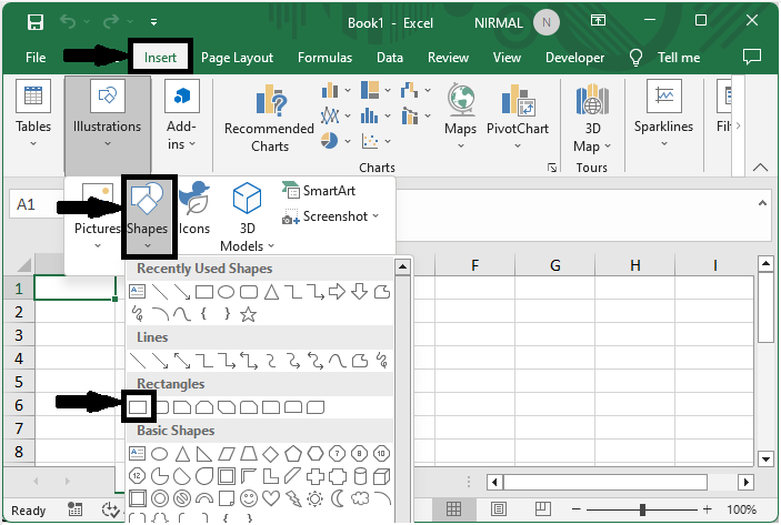 首先,单击“插入”,然后单击“形状”并选择一个矩形。