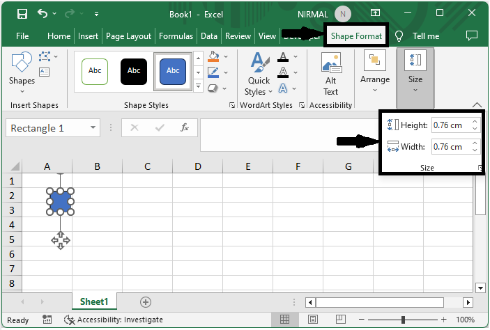 然后绘制一个形状。然后单击该形状,单击“形状格式”,并将“高度”和“宽度”设置为 0.76。