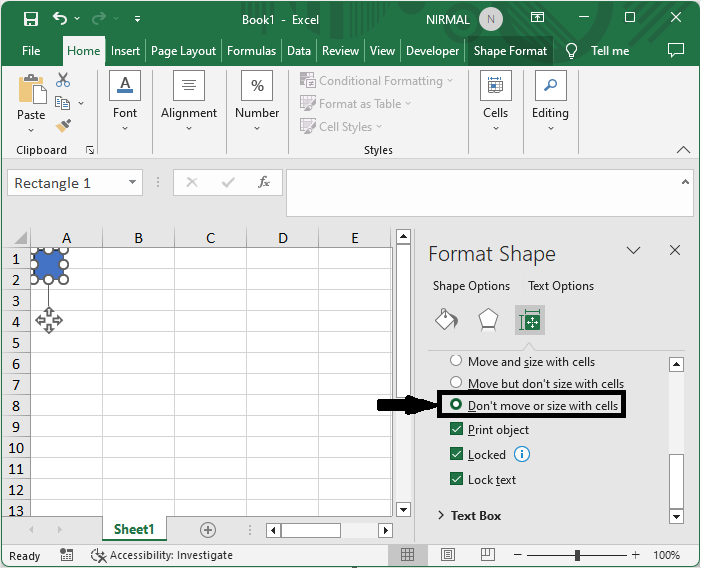 然后右键单击该形状,然后单击“大小和属性”,然后在“属性”下单击“不随单元格移动或调整大小”。