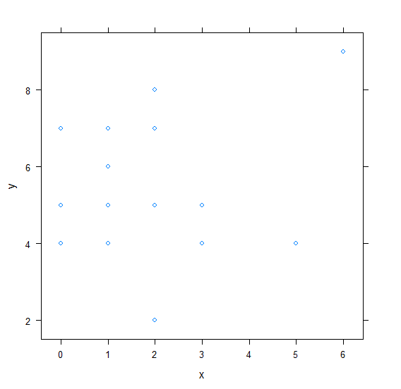 x<-rpois(20,2) y<-rpois(20,5) df<-data.frame(x,y) library(lattice) xyplot(y~x,df)