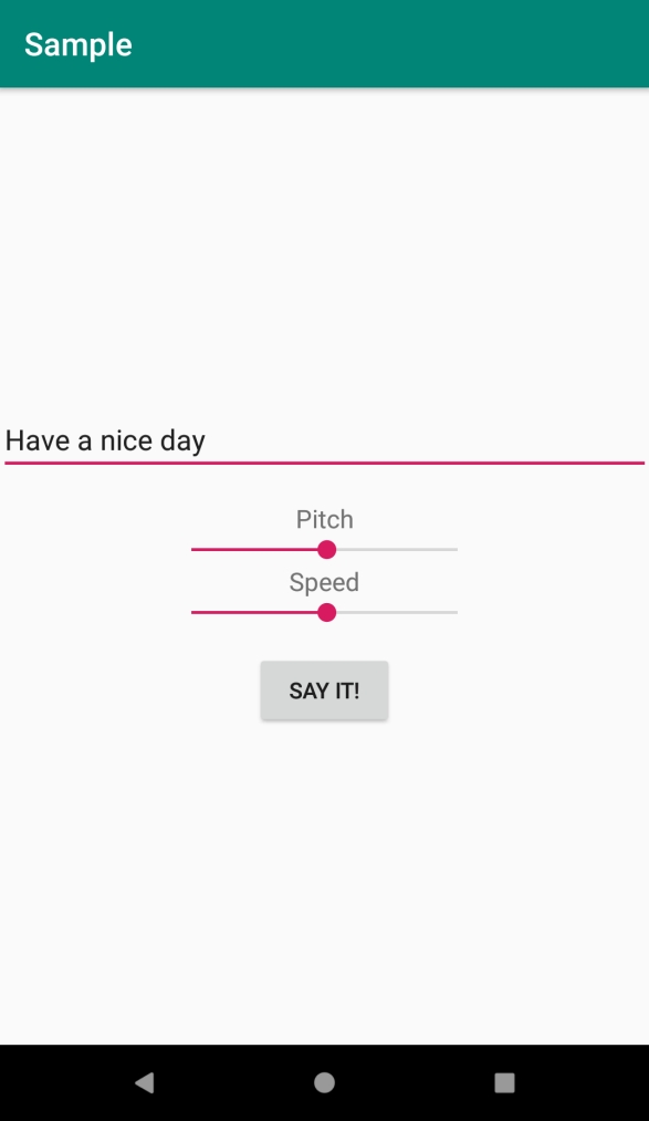 <?xml version="1.0" encoding="utf-8"?> <LinearLayout xmlns:android="http://schemas.android.com/apk/res/android" xmlns:tools="http://schemas.android.com/tools" android:layout_width="match_parent" android:layout_height="match_parent" android:orientation="vertical" android:gravity="center" tools:context=".MainActivity"> <EditText android:id="@+id/editText" android:layout_width="match_parent" android:layout_height="wrap_content" android:layout_marginBottom="16dp" android:hint="Enter Text" /> <TextView android:layout_width="wrap_content" android:layout_height="wrap_content" android:text="Pitch" android:textSize="16sp" /> <SeekBar android:id="@+id/seekBarPitch" android:layout_width="200dp" android:layout_height="wrap_content" android:progress="50" /> <TextView android:layout_width="wrap_content" android:layout_height="wrap_content" android:text="Speed" android:textSize="16sp" /> <SeekBar android:id="@+id/seekBarSpeed" android:layout_width="200dp" android:layout_height="wrap_content" android:layout_marginBottom="16dp" android:progress="50" /> <Button android:id="@+id/btnSpeak" android:layout_width="wrap_content" android:layout_height="wrap_content" android:layout_gravity="center_horizontal" android:enabled="false" android:text="Say it!" /> </LinearLayout>
