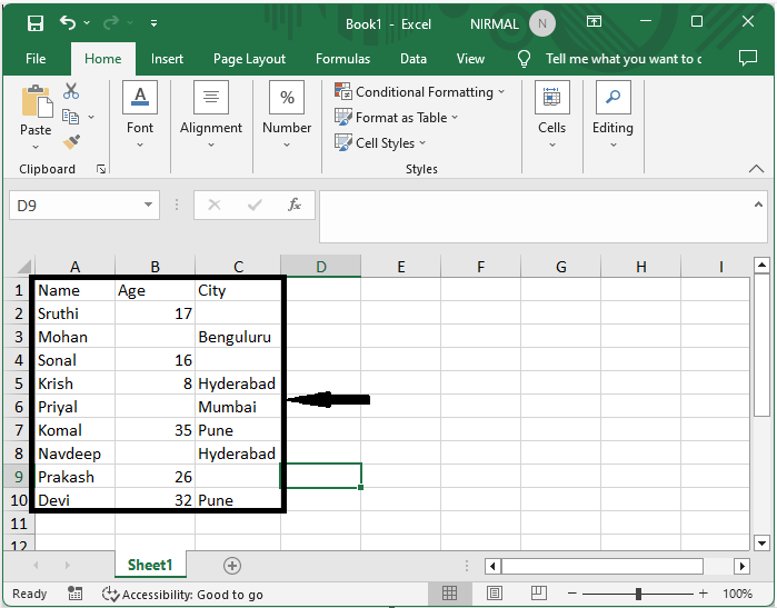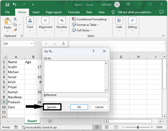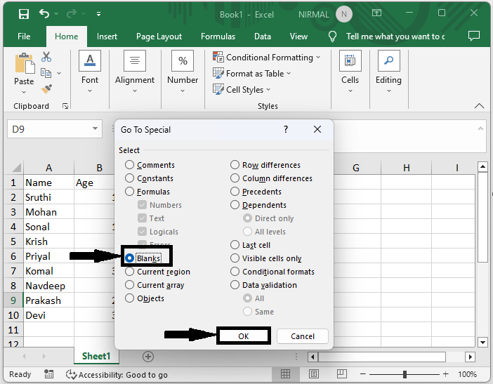 在这里,我们将使用“定位条件”功能来完成任务。因此,让我们来看一个简单的过程,了解如何删除空白单元格并在 Excel 中将数据向左移动。