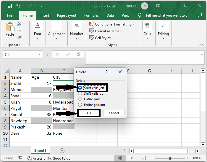 然后右键单击单元格并选择“删除”,然后单击“左移单元格”,然后单击“确定”以完成任务。