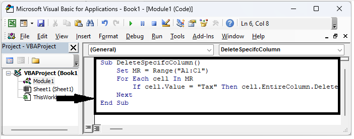 在代码中,“Tax”是列的标题值,而“A1:C1”是要删除的标题范围。