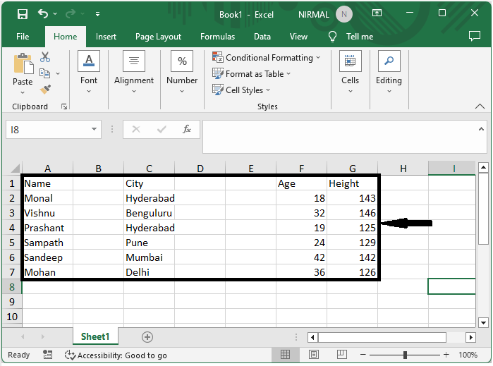 考虑一个Excel工作表,其中您的数据以表格形式显示,并且包含一些空列,如下面的屏幕截图所示。