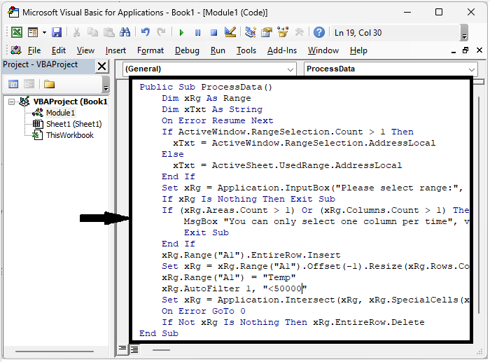 我们将使用 VBA 应用程序来完成此任务。让我们来看一个简单的流程,了解如何在 Excel 中删除单元格值大于或小于特定值的行的步骤。