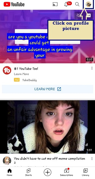 - 在您的设备上打开 YouTube 应用并登录您的帐户。在屏幕右上角,点击您的个人资料图片。