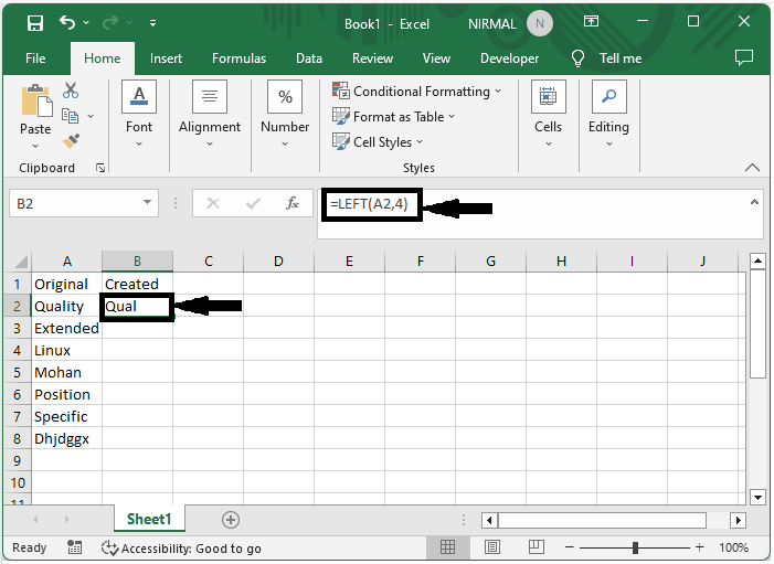 首先,单击一个空单元格,在本例中为单元格 B2,然后输入公式 =LEFT(A2,4),然后单击 Enter 以获取第一个值。在公式中,A2 是单元格的地址,4 是 n 的值。