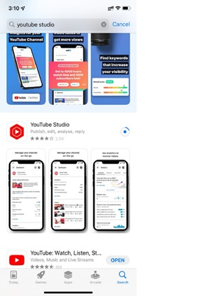 步骤 1 - 如果您是安卓用户,请前往 Play 商店;如果你是 iPhone 用户,请前往 App Store。在搜索栏中,输入 YouTube Studio 应用,然后点击“下载”按钮。