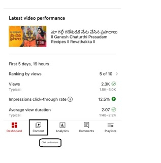 步骤 3 - 登录完成后,您将进入 YouTube Studio 的仪表板(如下所示)。点击“内容”选项卡。