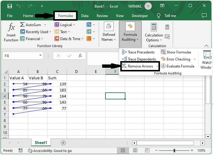 在这里,我们将以最简单的方式完成任务。让我们来看一个简单的流程,学习如何在Excel中删除追踪箭头。