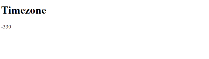 <!DOCTYPE html> <html> <body> <h1>Timezone</h1> <p id="test"></p> <script> const dt = new Date(); let diffTZ = dt.getTimezoneOffset(); document.getElementById("test").innerHTML = diffTZ; </script> </body> </html>
