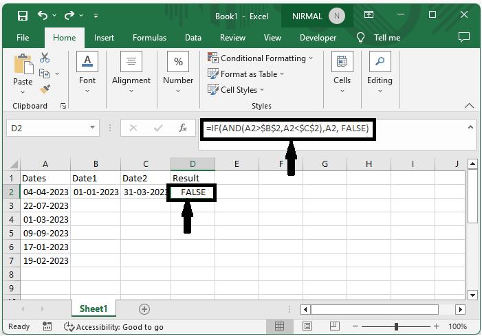 在这里,我们将首先使用公式获取任何一个结果,并使用自动填充柄完成任务。让我们来看一个简单的过程,了解如何在 Excel 中确定日期是否介于两个日期之间。