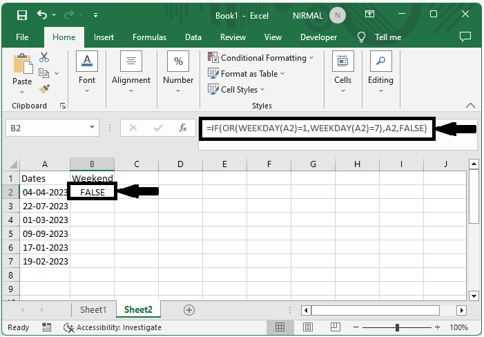 =IF(OR(WEEKDAY(A2)=1,WEEKDAY(A2)=7),A2,FALSE) 并单击回车键以获取第一个值。