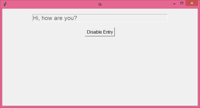 如果你运行以上代码,它会显示一个带有 Entry 小组件和一个禁用此 Entry 小组件的按钮的窗口。