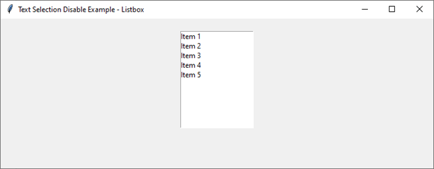 运行上述 Python 脚本后,您将看到一个包含项目的 Listbox 的 Tkinter 窗口。当您单击 Listbox 内的项目时,您会注意到文本选择被禁用了。