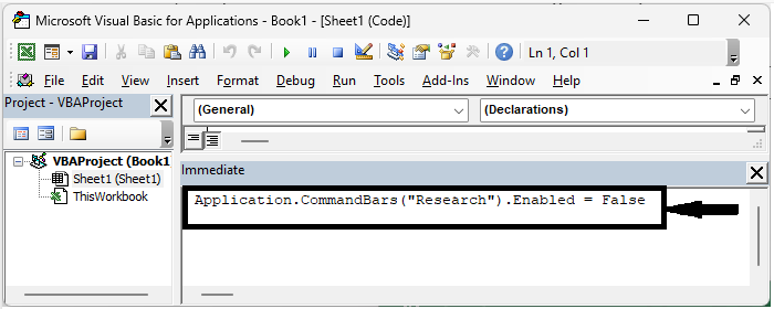 在这里,我们将代码添加到“立即窗口”,然后保存工作表以完成任务。让我们来看一个简单的过程,学习如何禁用Excel中的研究任务窗格。