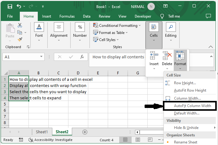 在这里,我们将首先选择单元格范围,然后自动调整列宽。因此,让我们看看一个简单的过程,了解如何在 Excel 中显示单元格的所有内容。