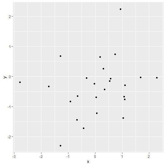 x<-rnorm(25) y<-rnorm(25) df<-data.frame(x,y) library(ggplot2) ggplot(df,aes(x,y))+geom_point()