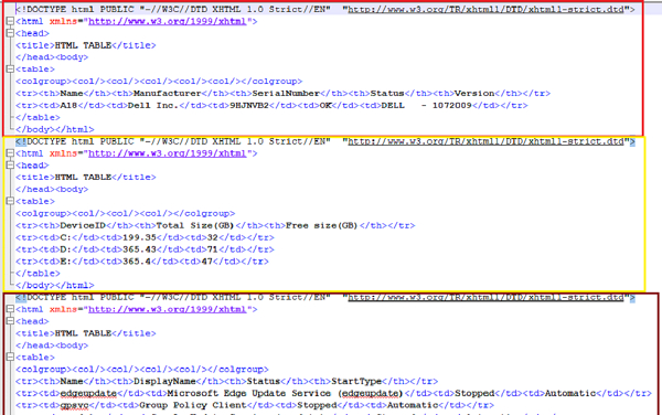 因为我们需要一个单独的HTML文件,我们将在ConvertTo-HTML命令中使用–Fragment参数,它告诉PowerShell不要为每个输入创建单独的HTML文件。我们将查看下面的脚本以更好地理解。