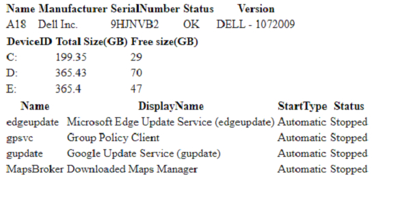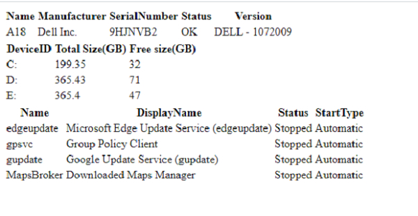 让我们来看一个简单的例子,不使用–Fragment参数。在下面的例子中,我们将显示BIOS信息、本地磁盘信息和自动停止的服务信息。