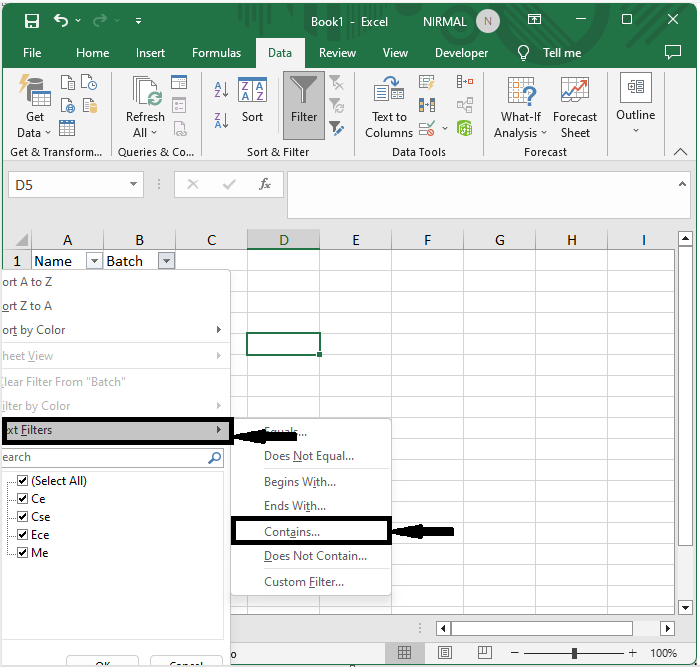 然后单击箭头,再单击“文本筛选”,并选择“包含”。
