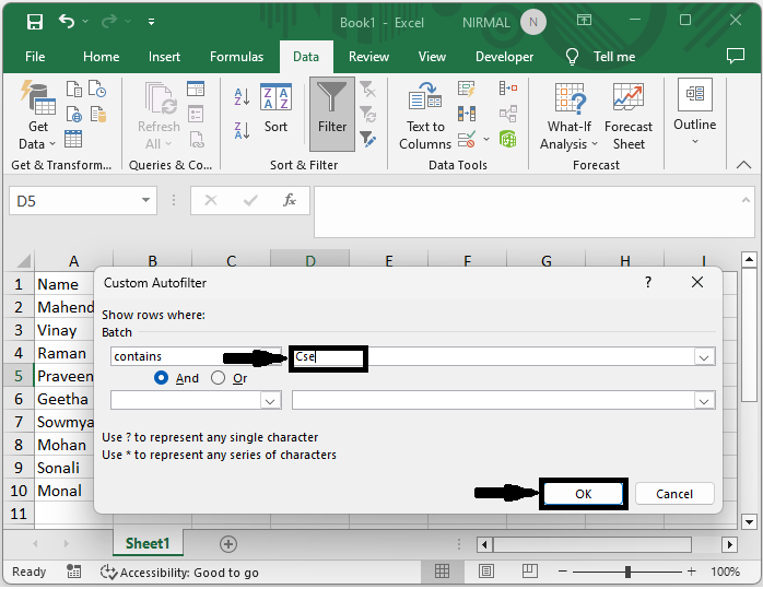 在这里,我们将应用筛选器来完成任务。让我们看看一个简单的过程,了解如何在 Excel 中仅显示包含特定文本的行。