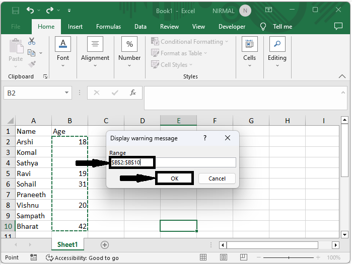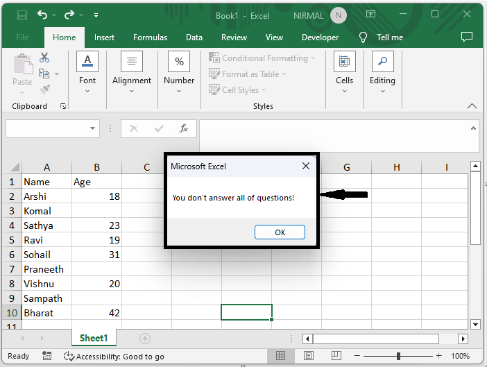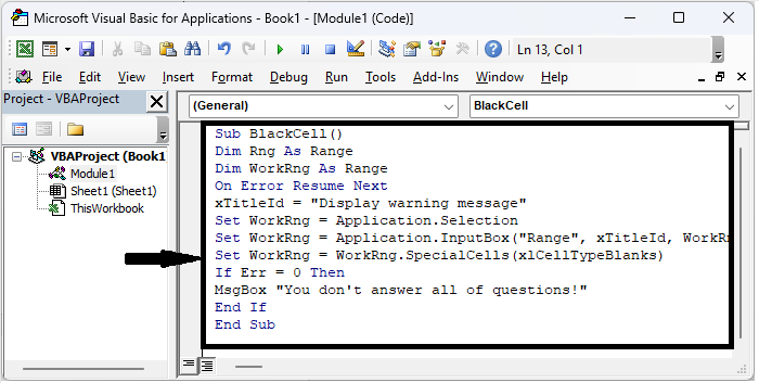 这里,我们将首先创建一个VBA模块,然后运行它来完成任务。让我们来看一个简单的过程,了解如何在Excel中显示单元格为空时的警告或警报消息。