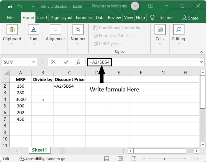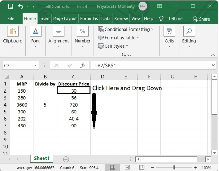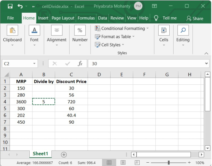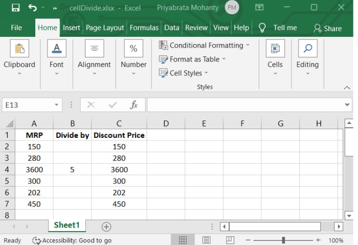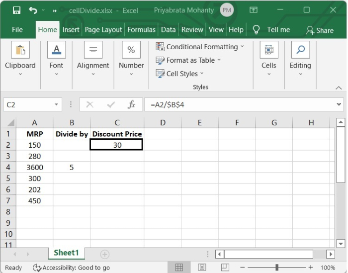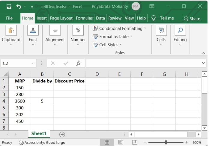在我们的示例中,我们有一些商品的最高零售价,我们需要计算每件商品的折扣价。我们假设每件商品有 20% 的折扣,这意味着我们必须用 5 除去每件商品的最高零售价。请参阅以下给出的图像以供参考。