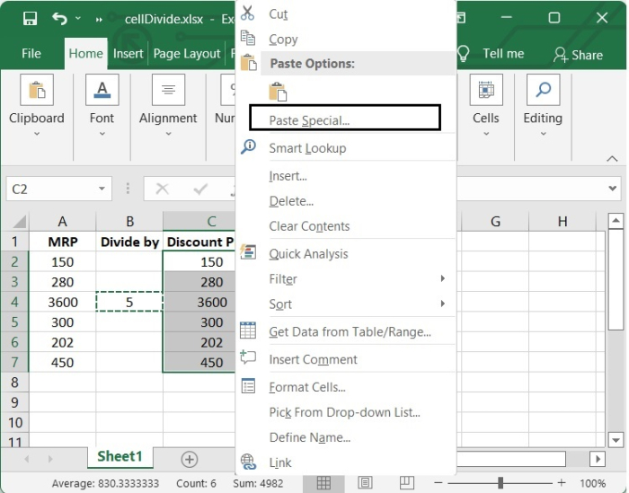 现在选择“5”并进行复制。然后选择“折扣价”列中的数字,然后单击鼠标右键。你将看到一个“粘贴特殊”选项,请单击该选项。