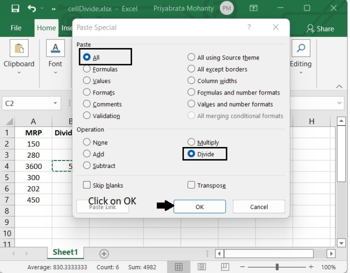 单击粘贴选项时,将打开一个弹出式粘贴选项菜单,然后选择“全部”,再单击“划分”选项,然后单击“确定”。请参阅下面给出的图像。