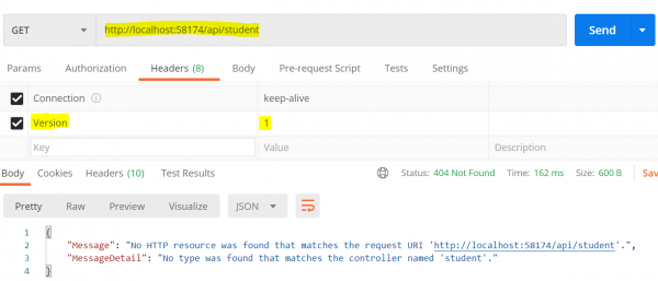 由于我们尚未在 Accept 头中处理版本信息,因此我们收到 404 未找到错误,因为我们只有 StudentV1 和 StudentV2 控制器。让我们添加我们自己的 **自定义控制器选择器**,它实现了 DefaultHttpControllerSelector 类。