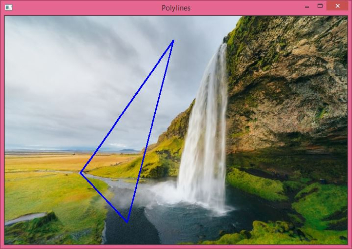 # import required libraries import cv2 import numpy as np # load the input image img = cv2.imread('nature_waterfall.jpg') # define an array of three points on image to draw the polylines # shape of point array [3,2] points = np.array([[155,320],[250,420],[345,50]]) # reshape the point array to make it 3D pts = points.reshape(-1,1,2) # now shape [3,1,2] # draw polylines on the image, passing desired values of the arguments img_poly = cv2.polylines(img, [pts], isClosed=True, color=(255,0,0), thickness = 2) # display the image with drawn polylines cv2.imshow("Polylines", img_poly) cv2.waitKey(0) cv2.destroyAllWindows()
