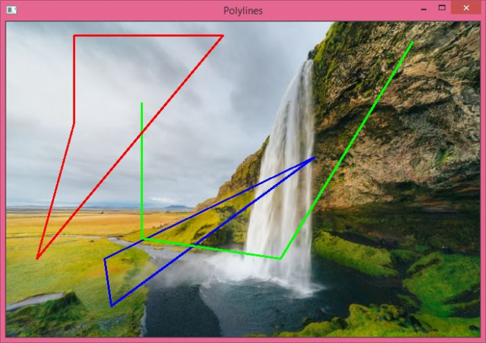 import cv2 import numpy as np # read the input image img = cv2.imread('nature_waterfall.jpg') # define the array of points points1 = np.array([[455,200],[155,420],[145,350]]) points2 = np.array([[200,120],[200,320],[405,350], [600,30]]) points3 = np.array([[100,20],[320,20],[45,350], [100,150]]) # reshape the points pts1 = points1.reshape(-1,1,2) pts2 = points2.reshape(-1,1,2) pts3 = points3.reshape(-1,1,2) # draw the polylines cv2.polylines(img, [pts1], isClosed=True, color=(255,0,0), thickness = 2) cv2.polylines(img, [pts2], isClosed=False, color=(0,255,0), thickness = 2) cv2.polylines(img, [pts3], isClosed=True, color=(0,0,255), thickness = 2) # display the image with drawn polylines cv2.imshow("Polylines", img) cv2.waitKey(0) cv2.destroyAllWindows()