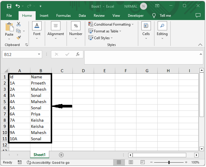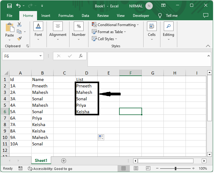 这里我们将首先使用公式获取第一个唯一值,然后使用自动填充柄完成列表。让我们来看一个简单的过程,了解如何在 Excel 中动态提取列区域中唯一值的列表。