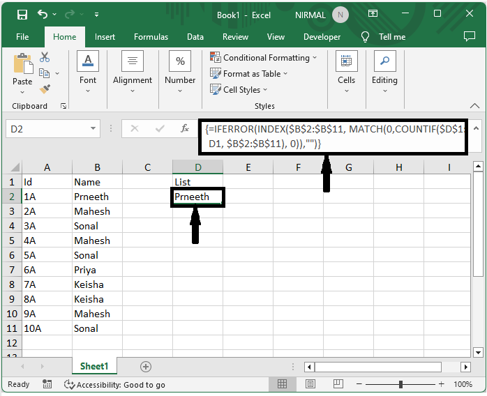 =IFERROR(INDEX($B$2:$B$9, MATCH(0,COUNTIF($D$1:D1, $B$2:$B$9), 0)), 并点击 Ctrl + Shift + Enter。