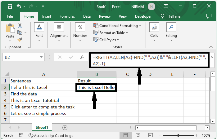 首先,单击空单元格(在本例中为单元格 B2),然后输入公式 =RIGHT(A2,LEN(A2)−FIND(" ",A2))&" "&LEFT(A2,FIND(" ",A2)−1),然后单击 Enter 以完成第一个结果。