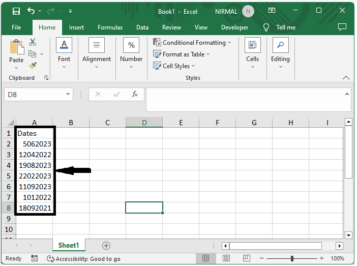 考虑一个Excel工作表,其中包含一系列不带斜杠的日期,类似于下图。
