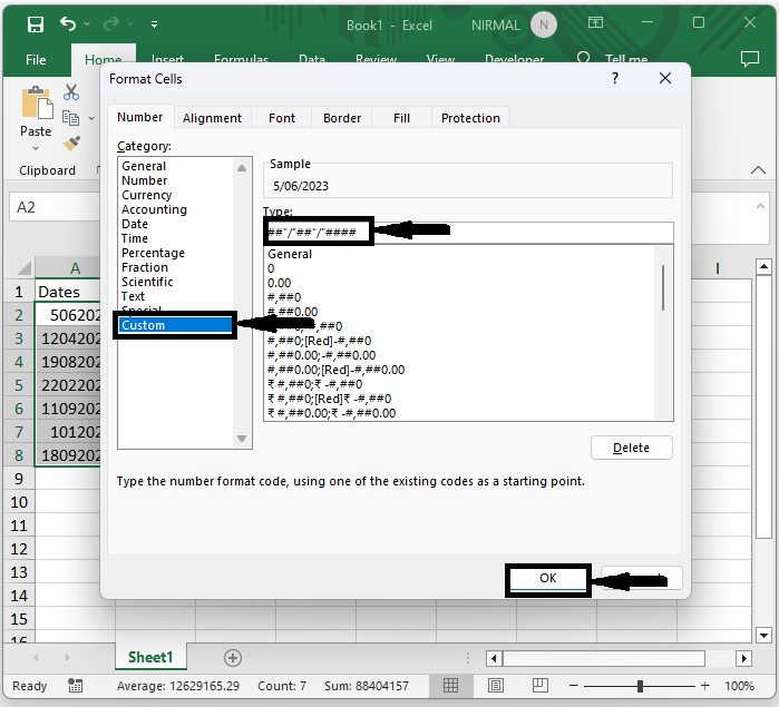 然后单击“自定义”,并将类型输入为“##/##/####”,然后单击“确定”以完成任务。