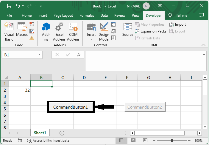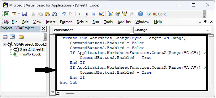 在这里,我们将向工作表添加 VBA 代码以完成任务。因此,让我们看看一个简单的过程,了解如何根据 Excel 中的单元格值启用或禁用按钮。