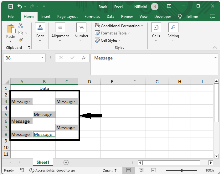 在这里,我们将首先选择单元格,然后输入数据来完成任务。让我们来看一个简单的过程,了解如何在Excel中一次性在多个单元格中输入相同的数据或公式。
