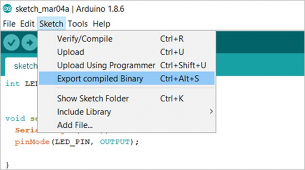 有时,您需要导出编译后的代码二进制文件,以便与同事共享,或使用其他编程器(如ISP编程器)编程您的开发板,或用于OTA(空中升级)目的。此导出的二进制文件(对于Arduino开发板实际上是hex文件)不仅包含您的应用程序代码,还包含hex格式的依赖项源代码。导出此二进制文件的方法如下: