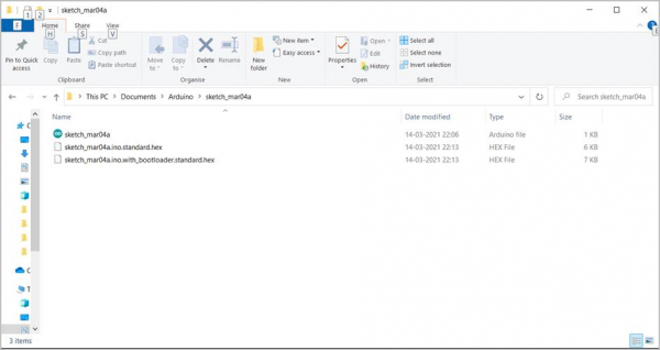现在,导航到包含您的草图(您的.ino文件)的文件夹。您可以使用 **草图 -> 显示草图文件夹** 来导航到草图文件夹。